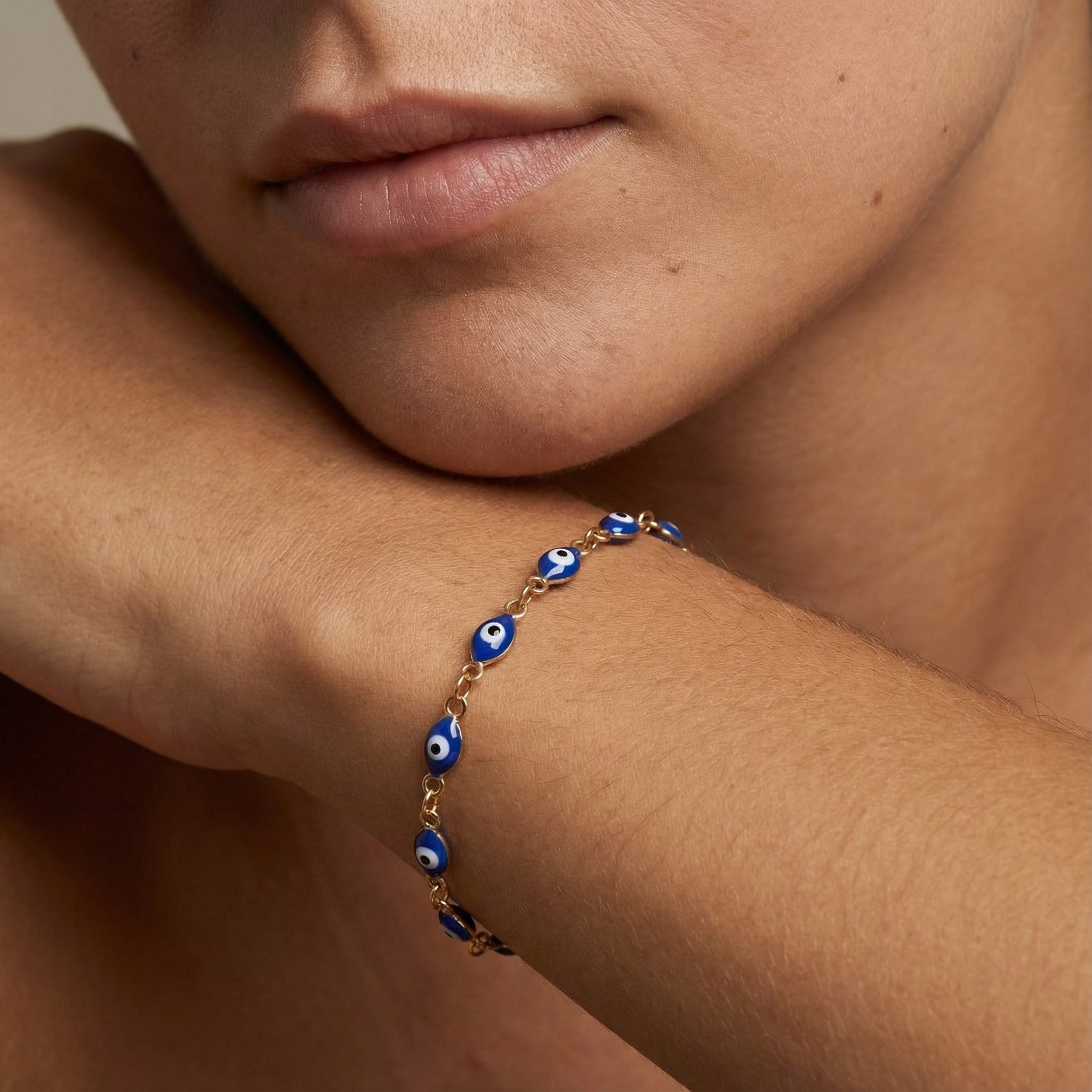 Bracelet en acier inoxydable, orné de perles œil protecteur bleues. Symbolique, raffiné et intemporel.