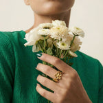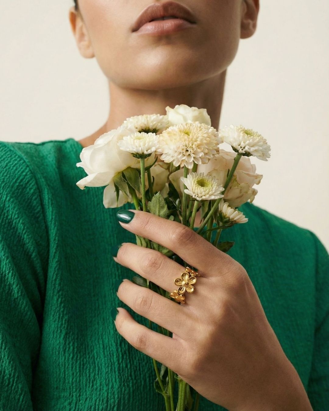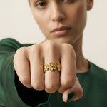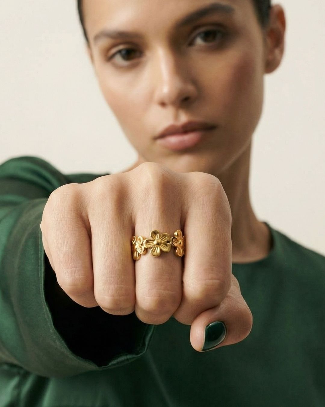 Bague en acier inoxydable plaqué or 18K avec un design floral délicat, parfaite pour ajouter une touche d'élégance à votre look.