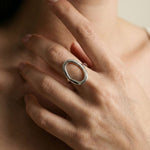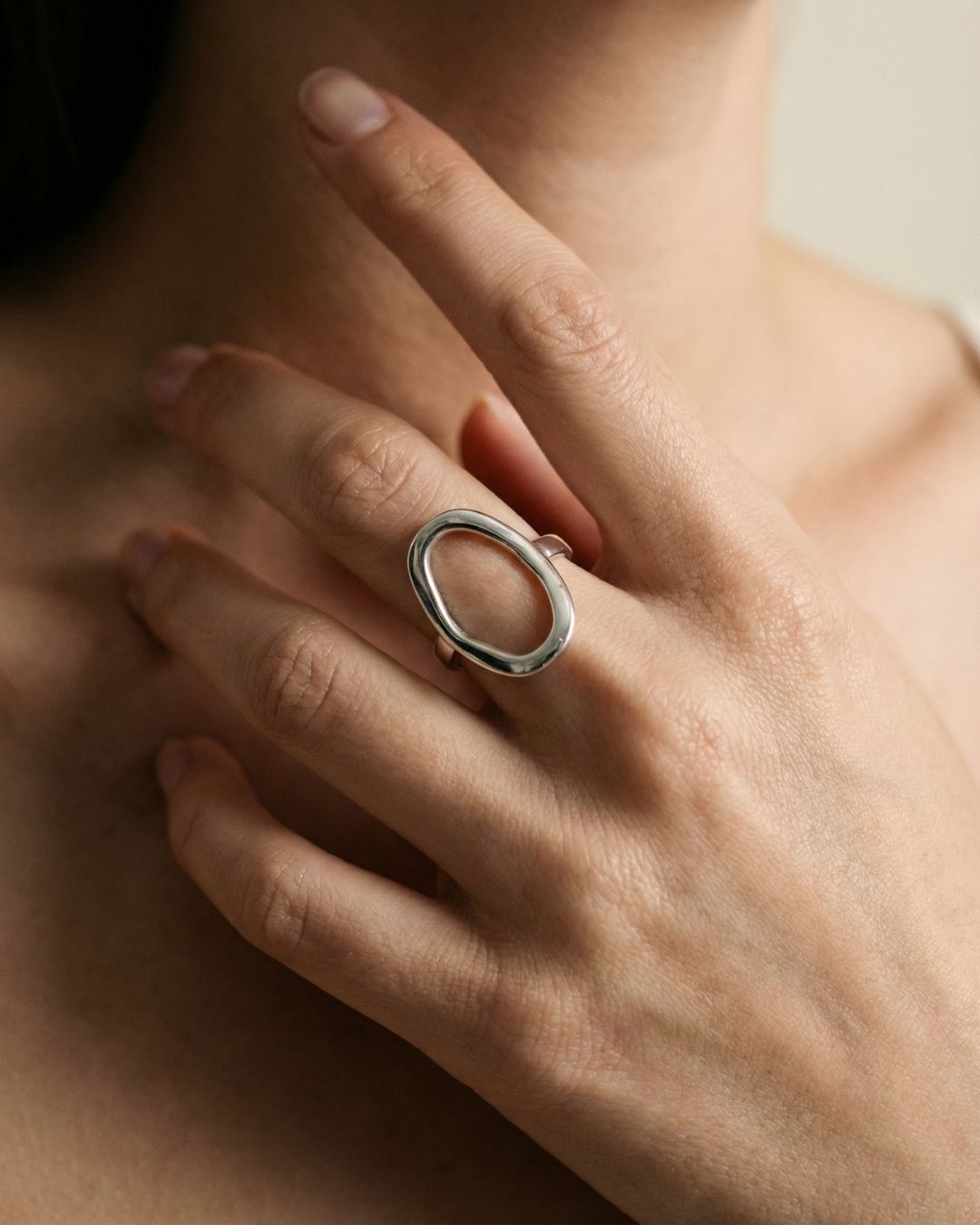 Bague ouverte en acier inoxydable argenté, au design minimaliste et organique, évoquant la fluidité et l’éternité. Une pièce intemporelle et élégante.