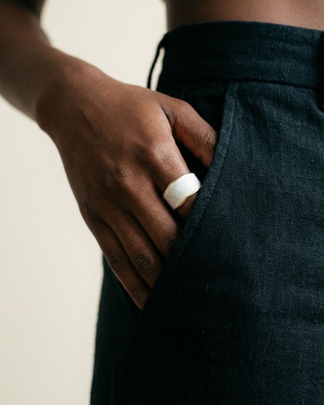 Bague ouverte en acier inoxydable doré avec émail texturé, élégante et contemporaine.