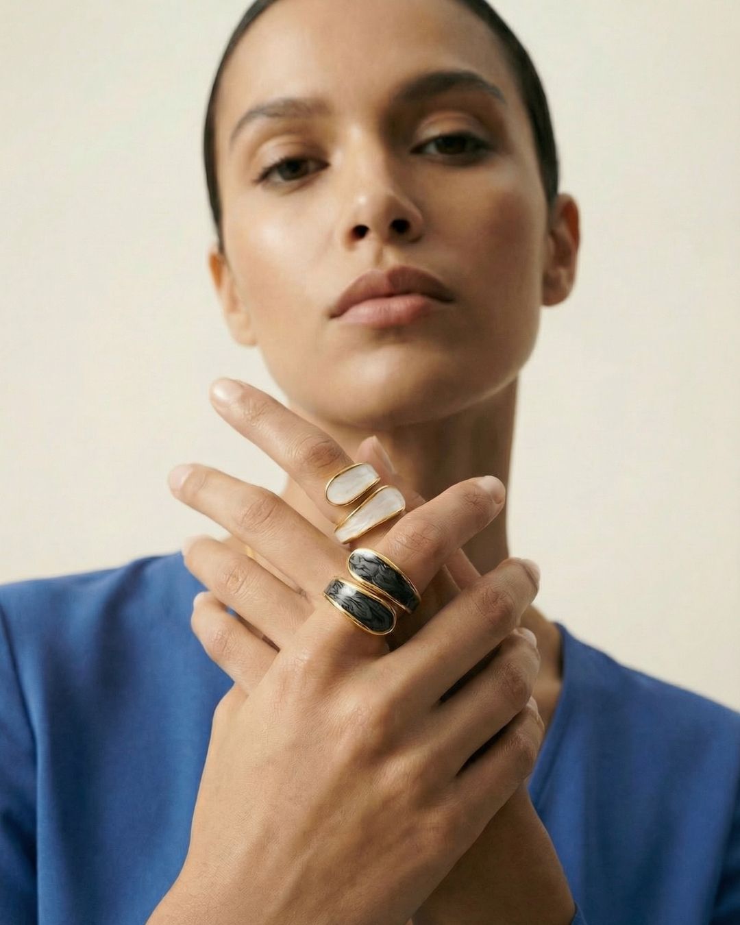 Bague ouverte en acier inoxydable doré, ornée de deux bandes d’émail nacré, moderne et raffinée.