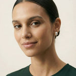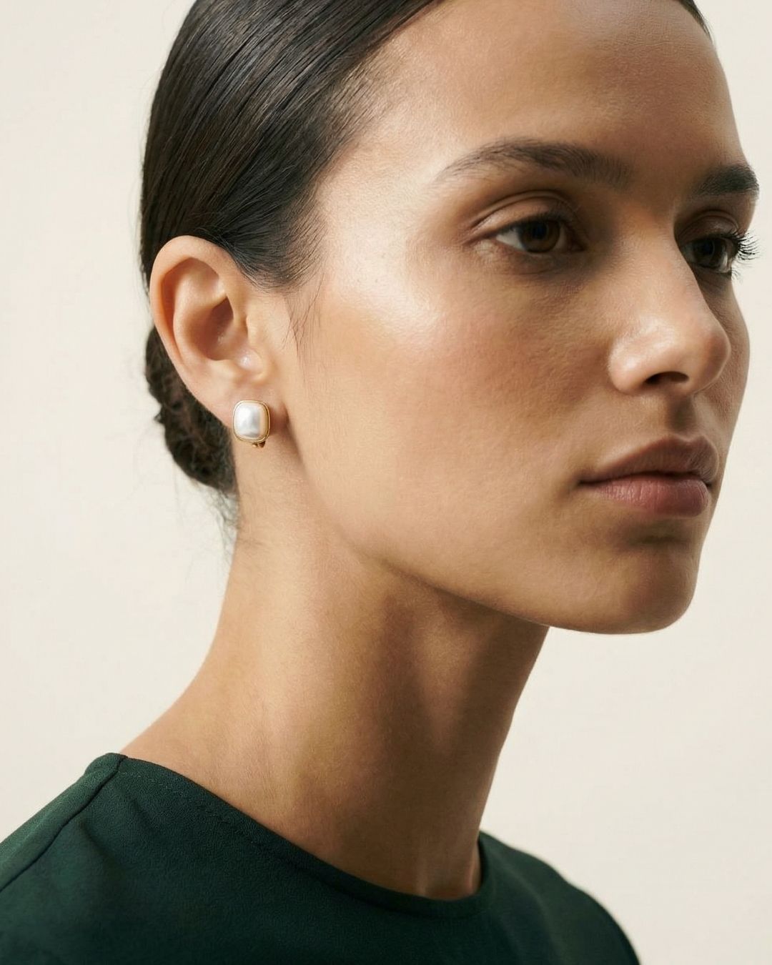 Boucles en acier inoxydable plaqué or, serties d’un cabochon nacré. Une allure sophistiquée qui joue avec la lumière pour un éclat subtil.