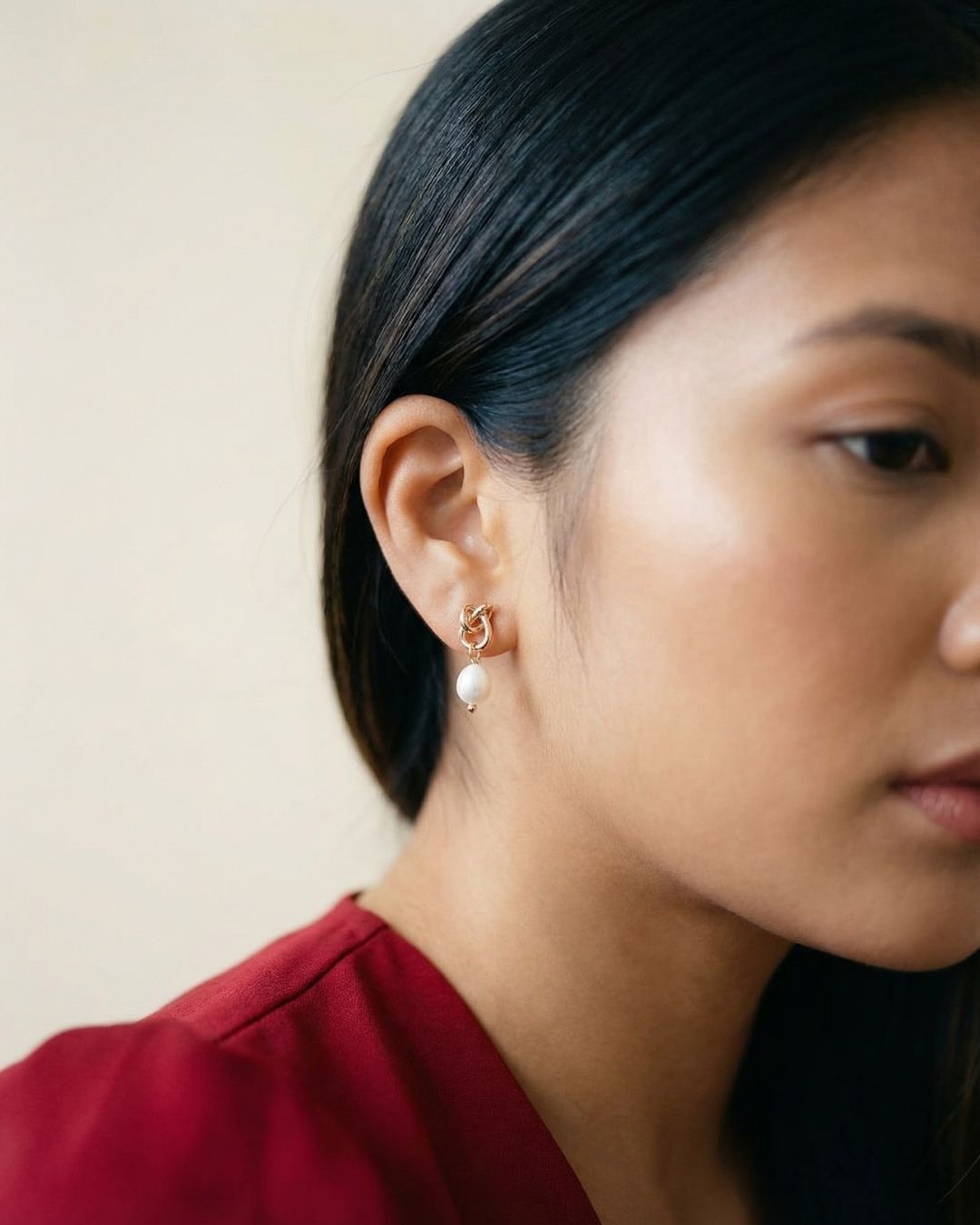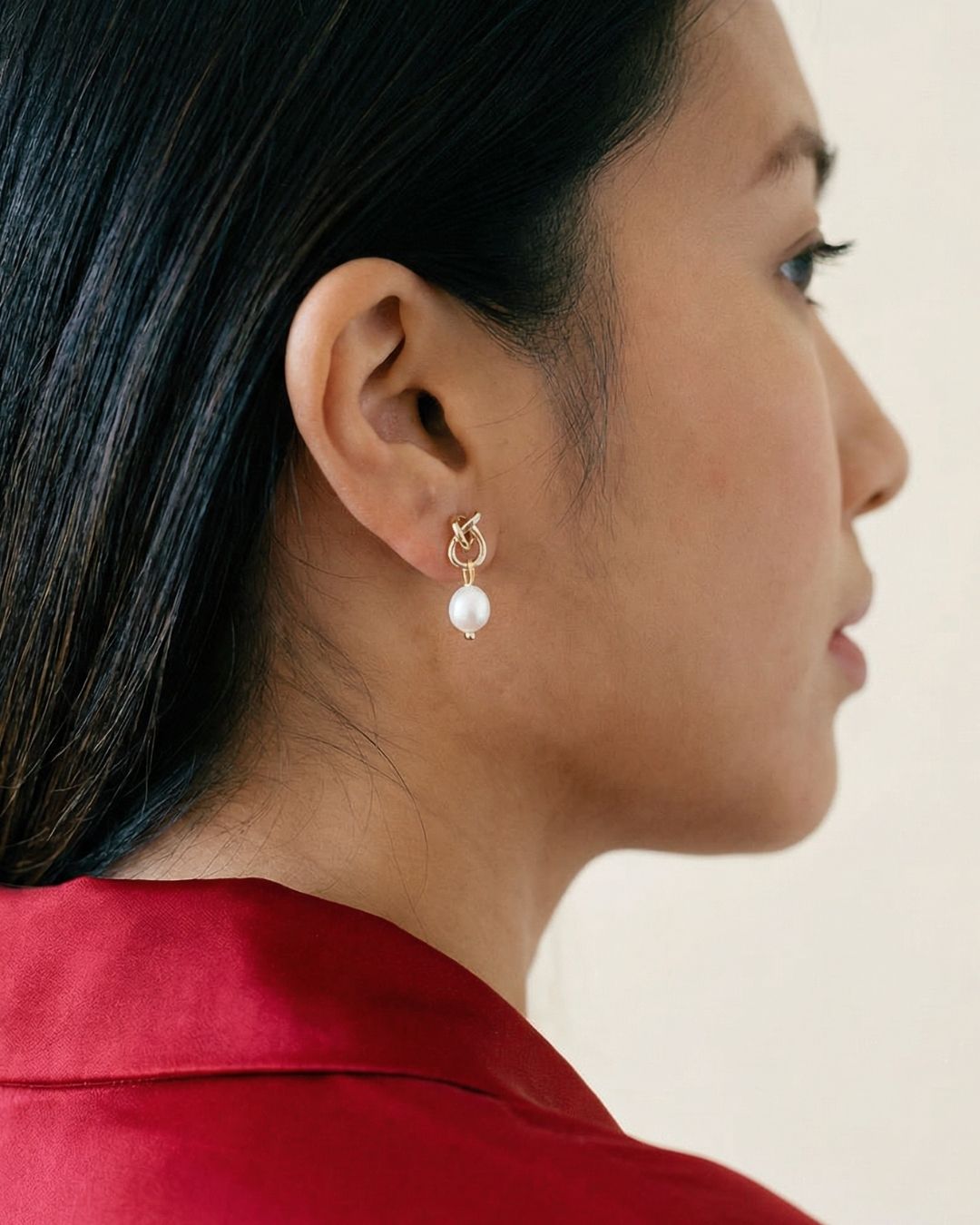 Boucles en acier inoxydable avec motif nœud, ornées de perles délicates. Une touche d’élégance discrète aux accents romantiques.