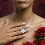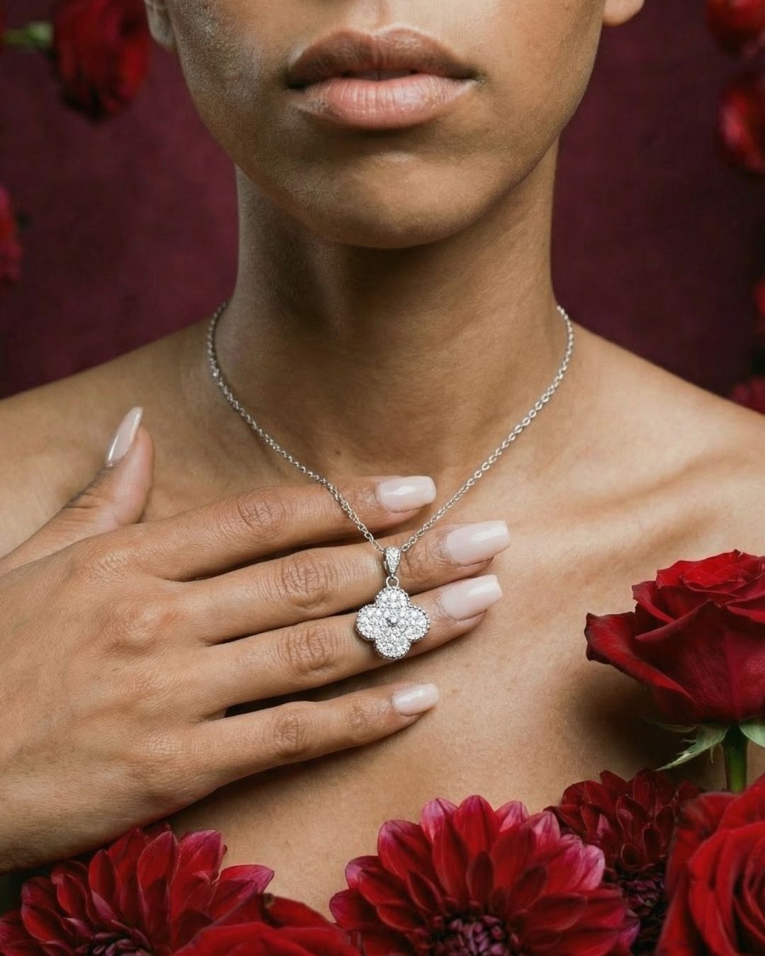 Collier en acier inoxydable argenté, orné d’un pendentif trèfle pavé de zircons. Un éclat raffiné, symbole de chance et d’élégance intemporelle.