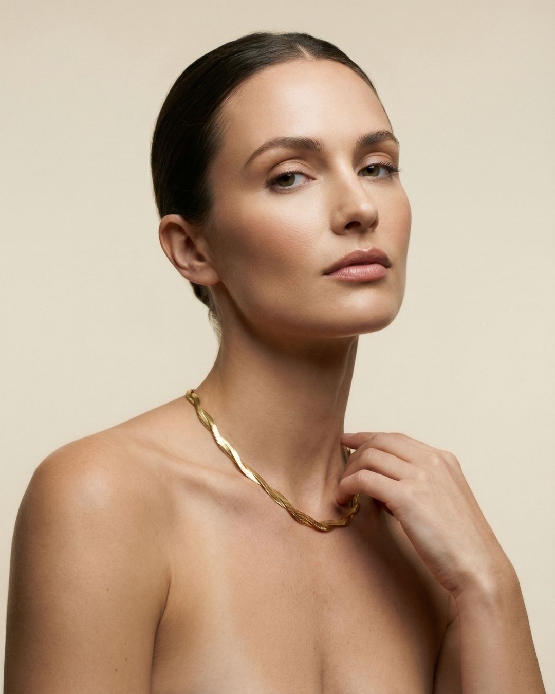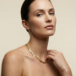 Collier en acier inoxydable plaqué or 18K, au design tressé sophistiqué. Élégance sculpturale et allure affirmée.