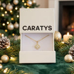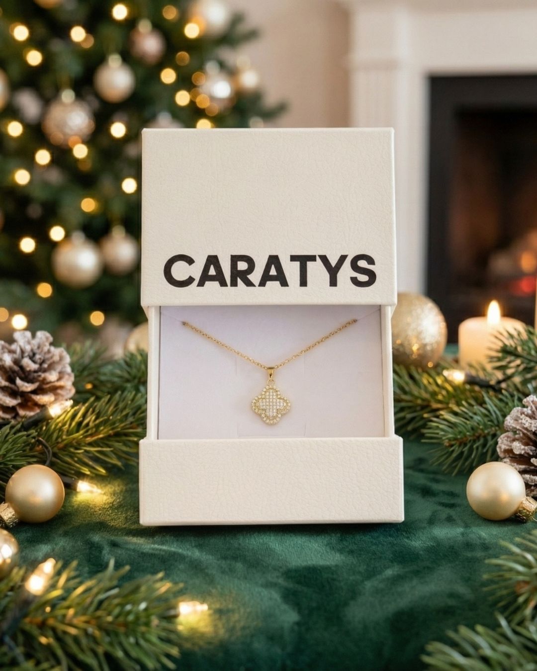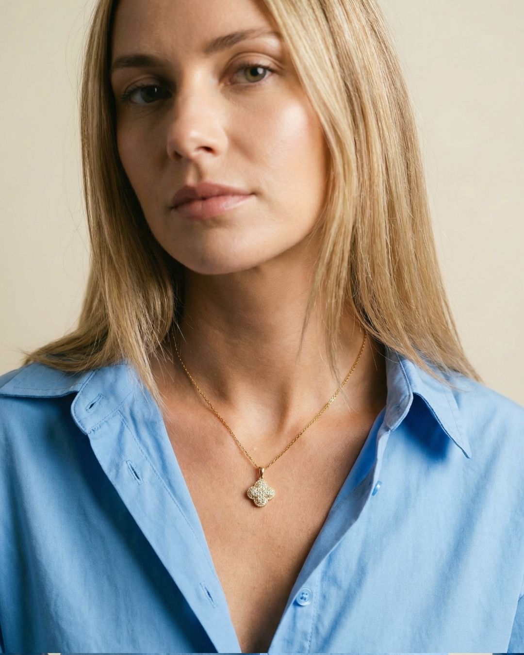 Collier en acier inoxydable plaqué or 18K, orné d’un pendentif trèfle pavé de zircons. Un éclat solaire, symbole de chance et d’élégance intemporelle.